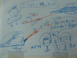 2月20日、テレビでカダフィ大佐の息子セイフ・アル-イスラムは「最後の銃の一発まで戦う」「リビアの総ての河が血になるまで戦う」「リビアはチュニジアやエジプトとは違う」などと恐ろしい宣言をした。ONU国連や米仏の批判が21日になってようやく始まった。その間に400人もの人が殺害されている。余りにも時機を逸していて遅すぎたのではないか。2月21日になってようやく国連の潘基文事務総長がリビアのカダフィ大佐と電話で40分ほど話し「即刻に暴力をやめるよう要求した」とスポークスマンいっている。同スポークスマンはリビア軍隊は飛行機とヘリコプターから民衆に向けて撃ったと発表している。