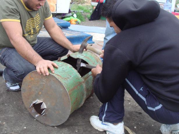 男たちはドラム缶でストーブを作って、寒い冬に向けての準備を始めた。