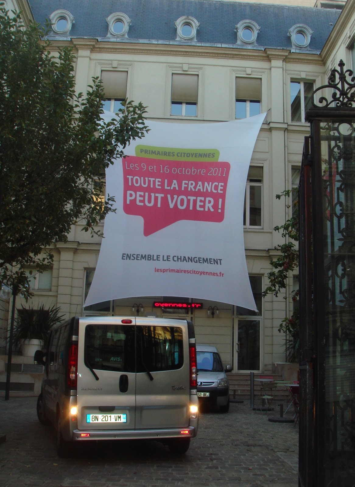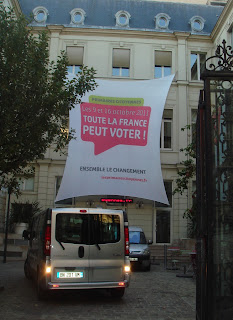 | オルセー美術館近くのソルウェリーノ通りにある 仏社会党本部 フランス全土が投票できると書かれた横断幕は 仏社会党の大統領候補予備選挙(プリメール) というフランスの最近の歴史では初めての、候補 者の民主的な選出方法をうたっている。 (写真撮影は筆者) |