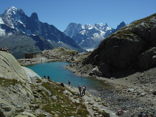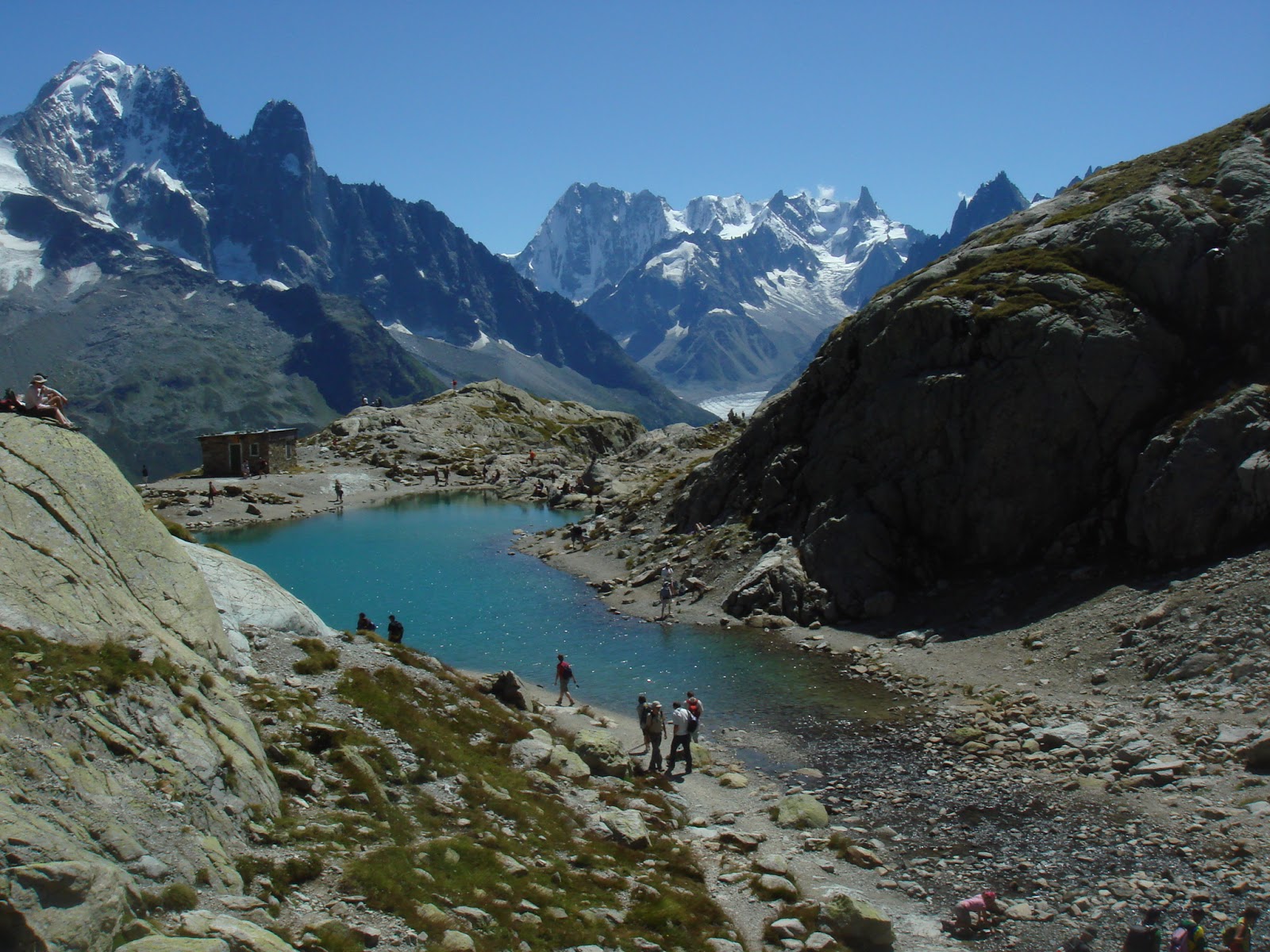 中央山塊の左端がグランド・ジョラス、メール・ド・グラスもかすかに姿を見せている。フランスとイタリア国境の山で標高は4208メートル。アイガー・マッターホルンと並び欧州三大北壁も持つ。(写真撮影は筆者) |