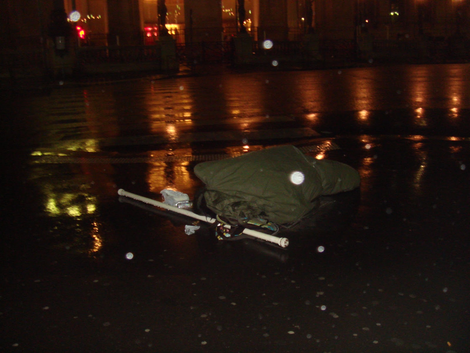 雨の中、路上で寝ている人。始めはなにかゴミでも置かれているのかと思ったが、急に動いたので人だとわかった。