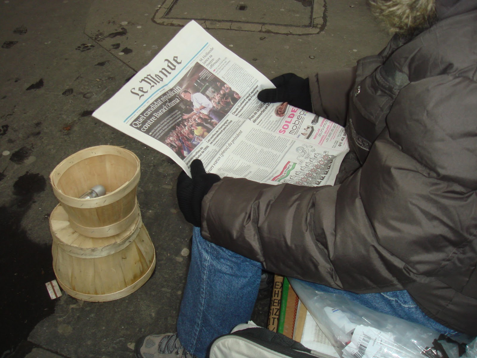 | 中年の男性は寒い中でフランスの高級紙といわれるルモンド紙を読んでいた。わざわざお願いして一面を手にしてもらった。高級バターを入れる木の丸い容器を使ってお金を集めていた。男性はかばんを開けて見せて、他にフィガロ紙やパリジャン紙もあるといった。 |