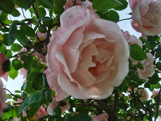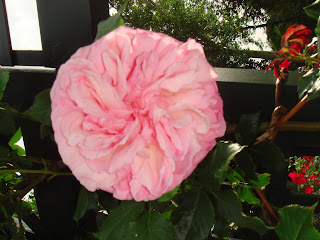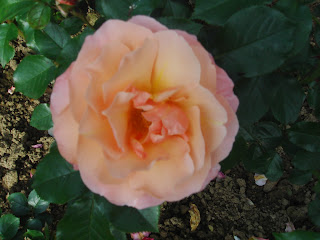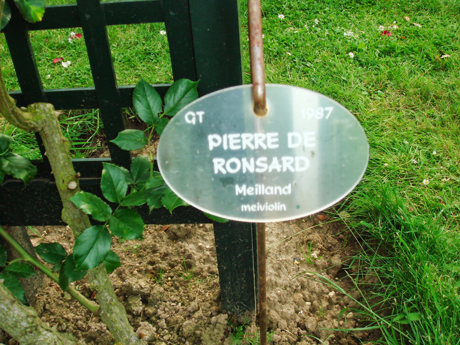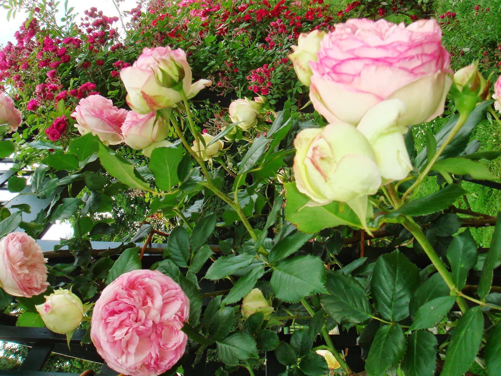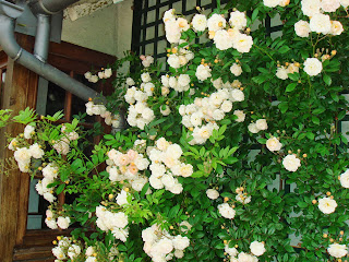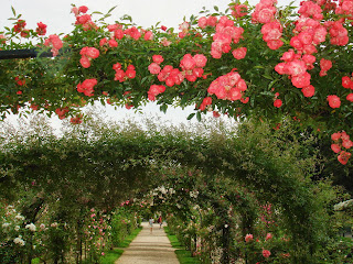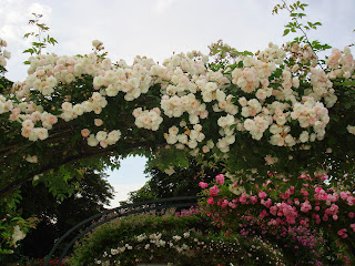 私の特に気に入ったのは東側と西側の塀をよじ登るようにして植えられた背の高い、中世の庭園や宗教画に出てきそうなバラであった。入り口から右回りに見るか左回りにするかで趣向が変わるだろう。右回りが面白いと思ったのは、東から西へ、そして古いバラから現代のバラへという感じでみるほうが自然だと思ったからだ。
