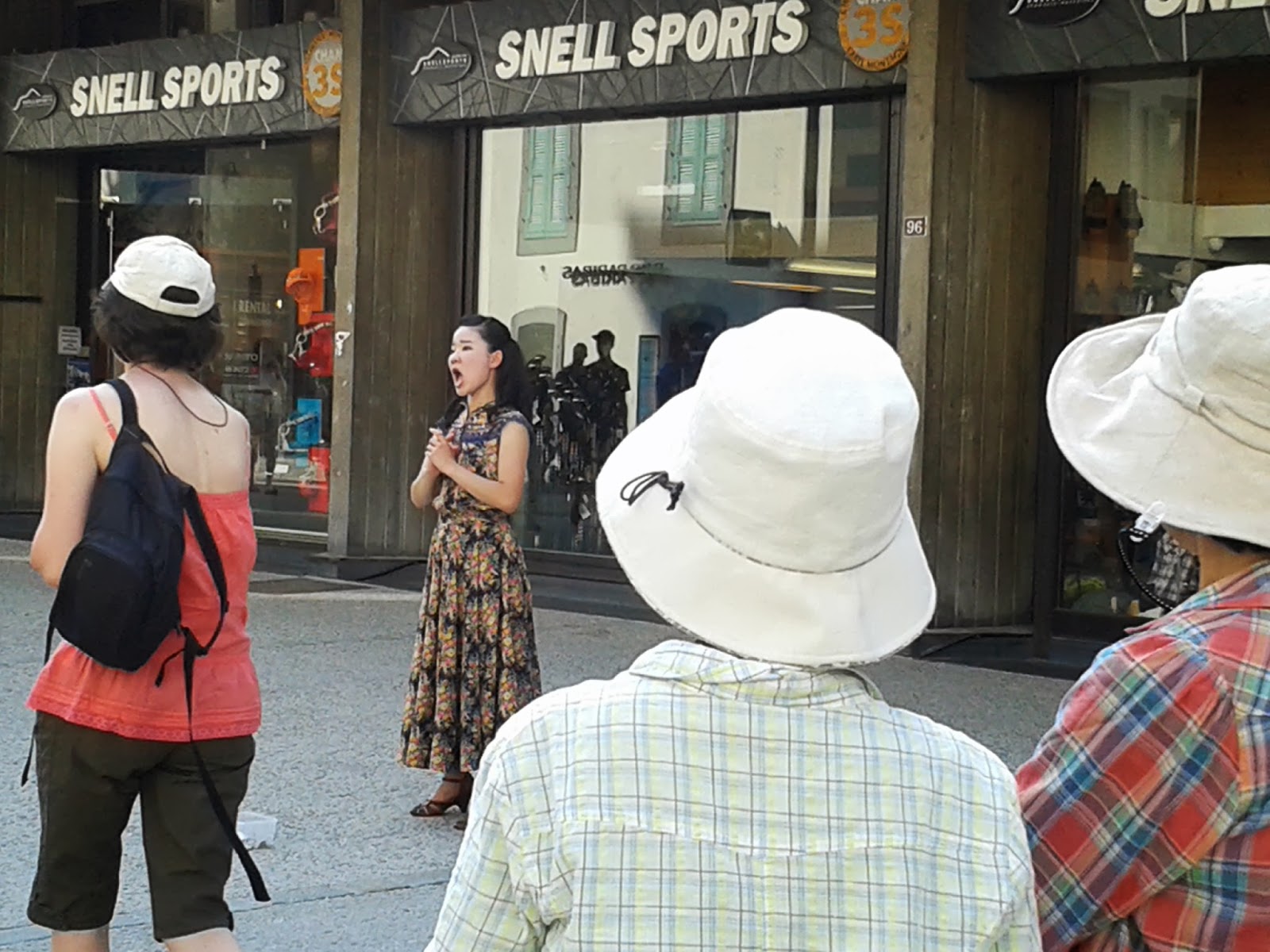 シャモニーの歌姫に日本人観光客もしばし足を止め彼女の歌に聞き入る。小山さんはストラスブルグで声楽を勉強中だ。将来は現代音楽へ行くかもしれないと語った。 夏のバカンスでシャモニーに来ていてレストランでアルバイトをしているという。休憩中に広場で歌をうたっているのだと説明してくれた。