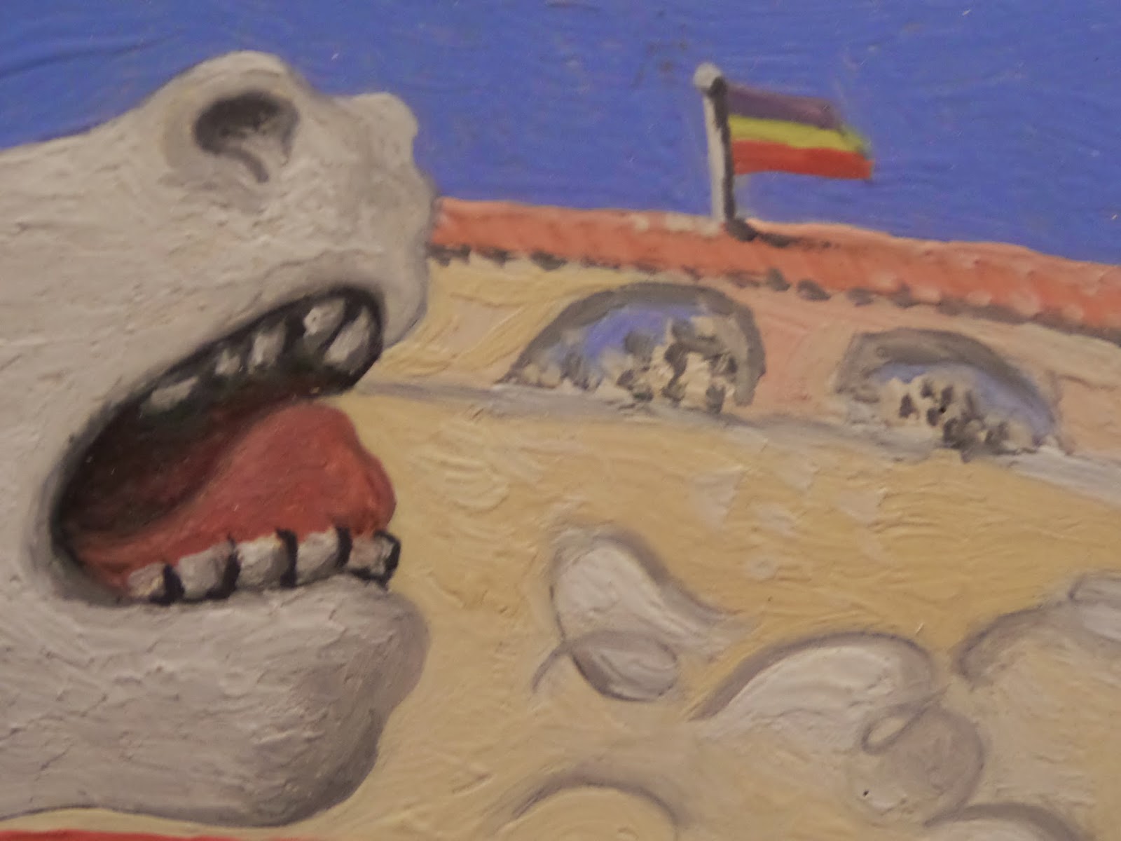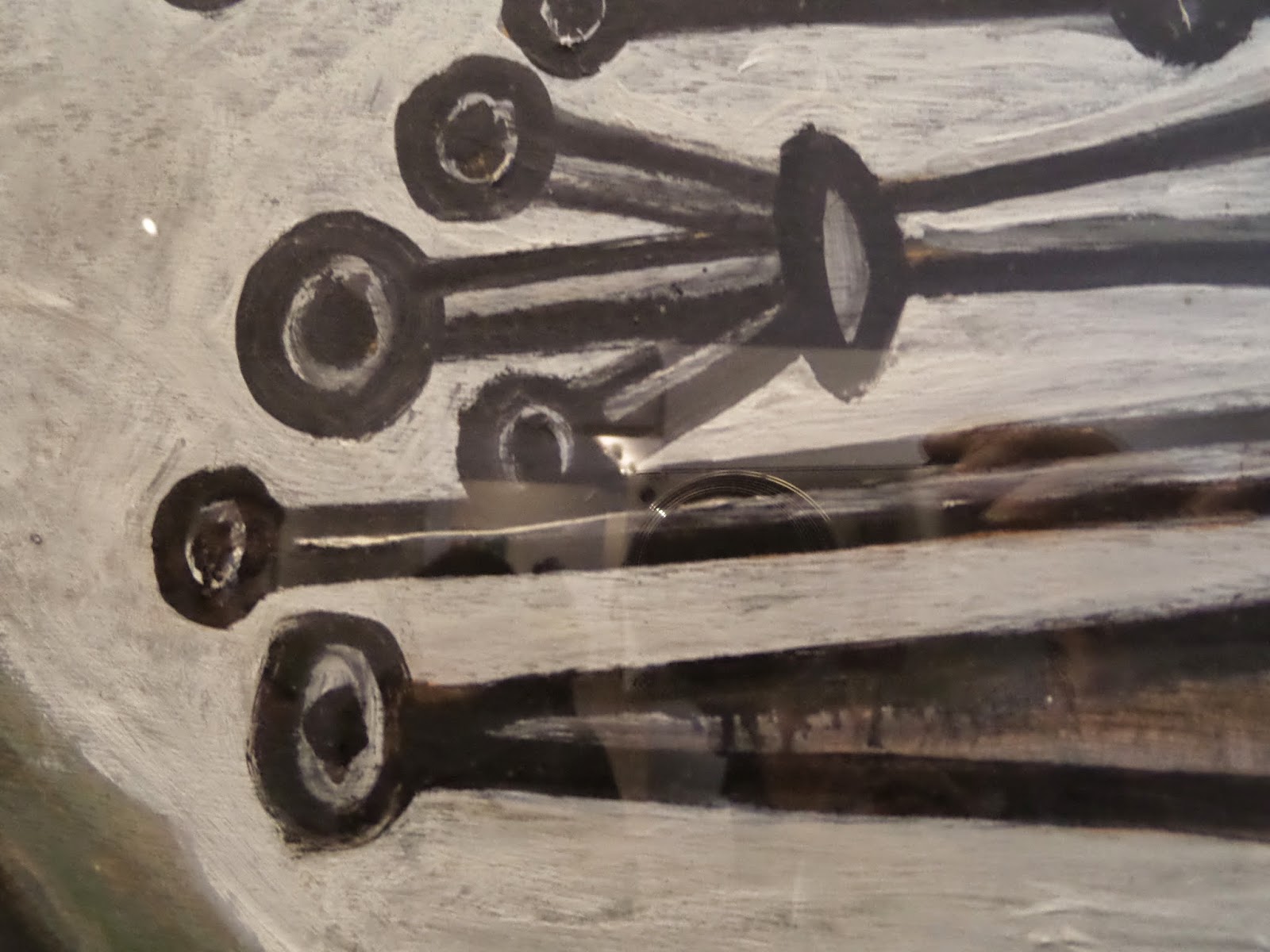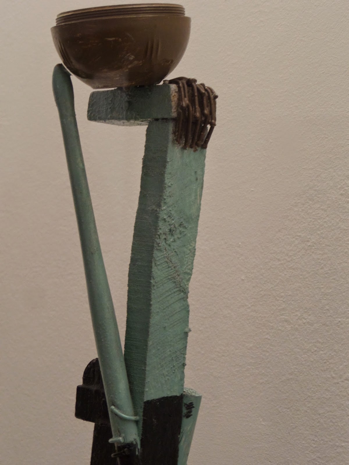 何処にでもあるような荒削りの木片に色を塗り、釘を並べ人型を象徴した組み立て。さまざまな物質の一回期でしかない出会い、コンポジィションの遭遇がここにある。
