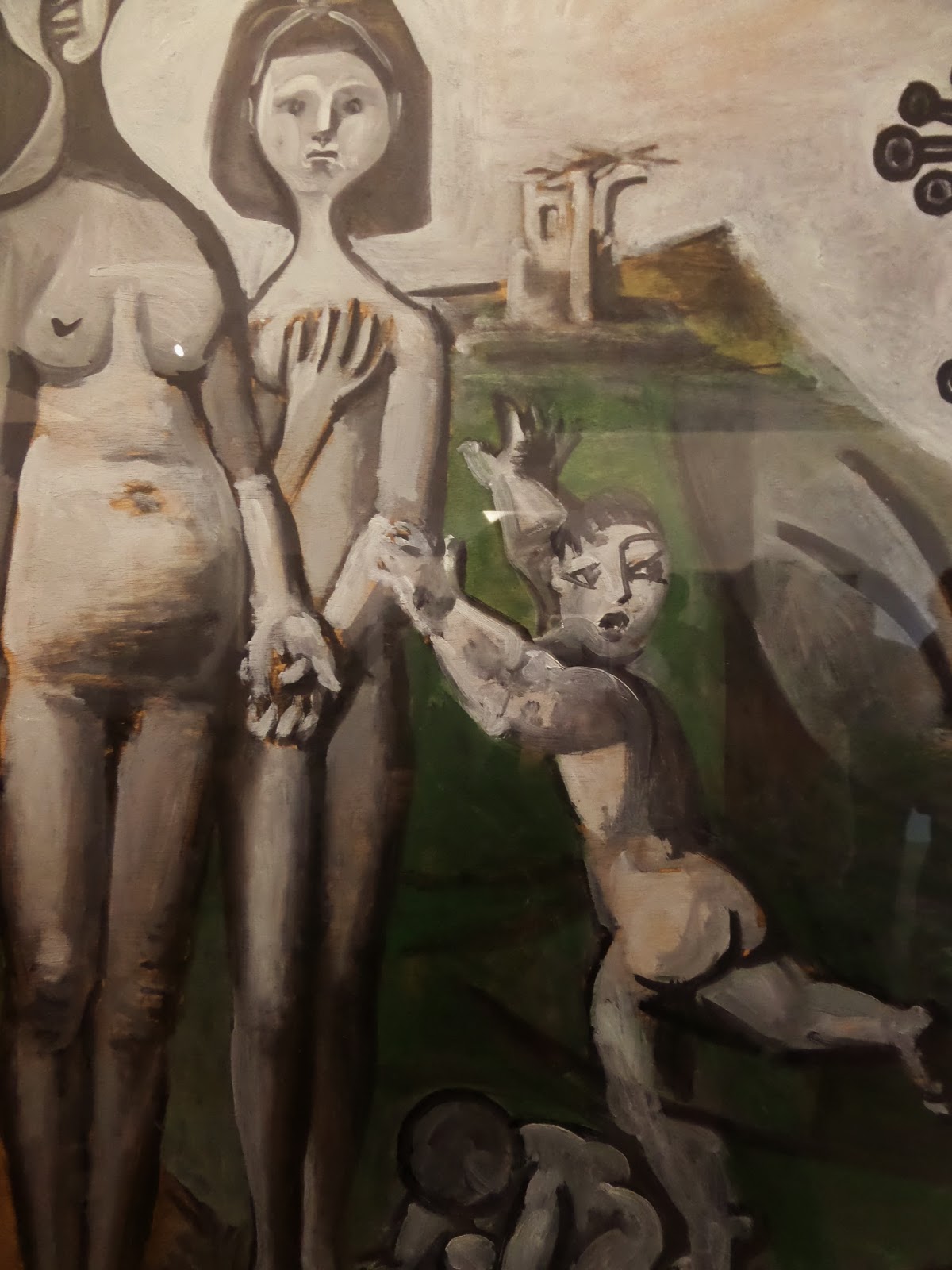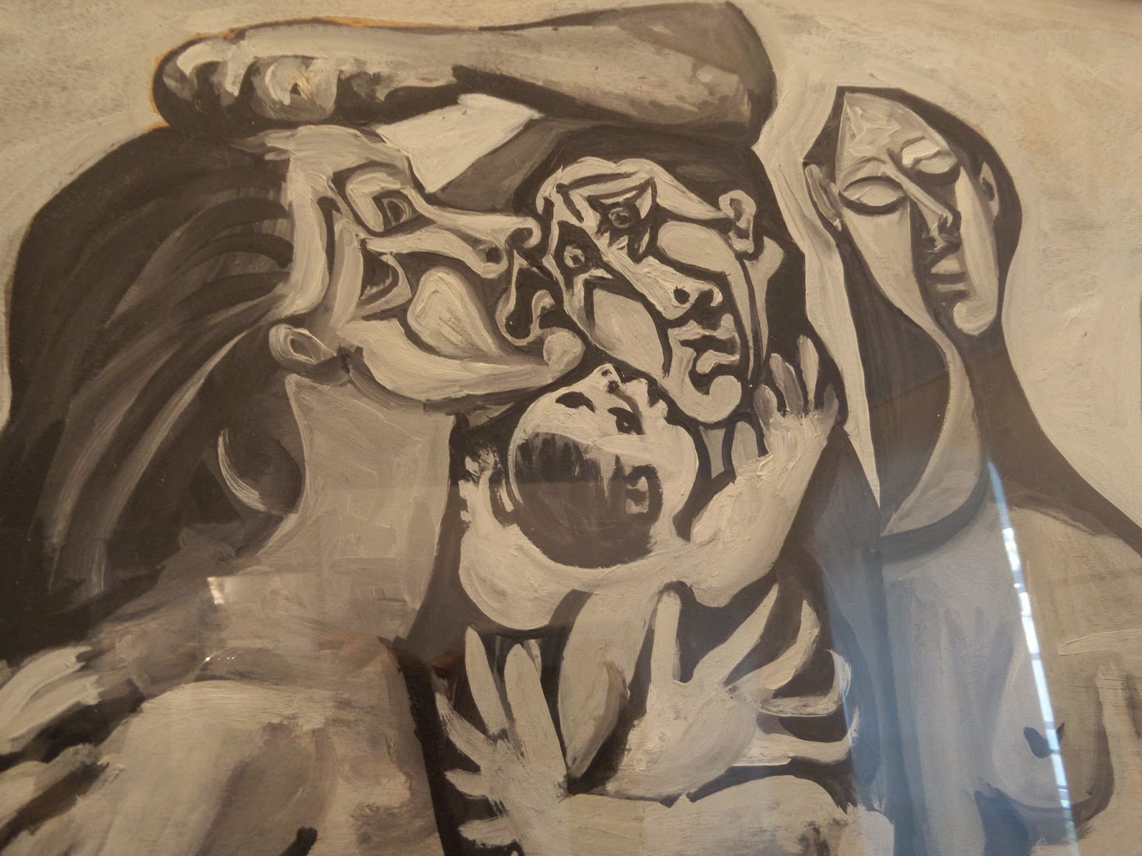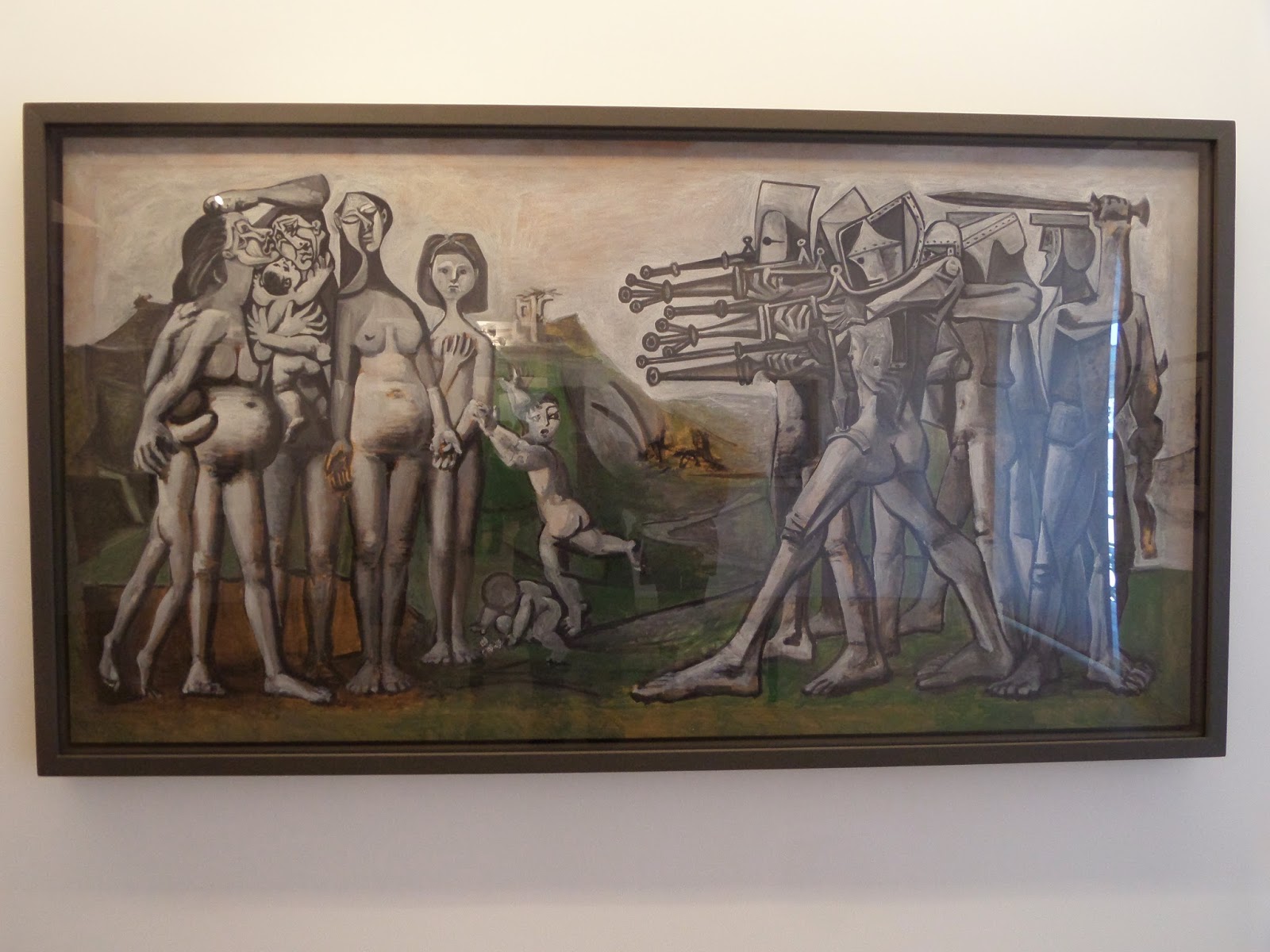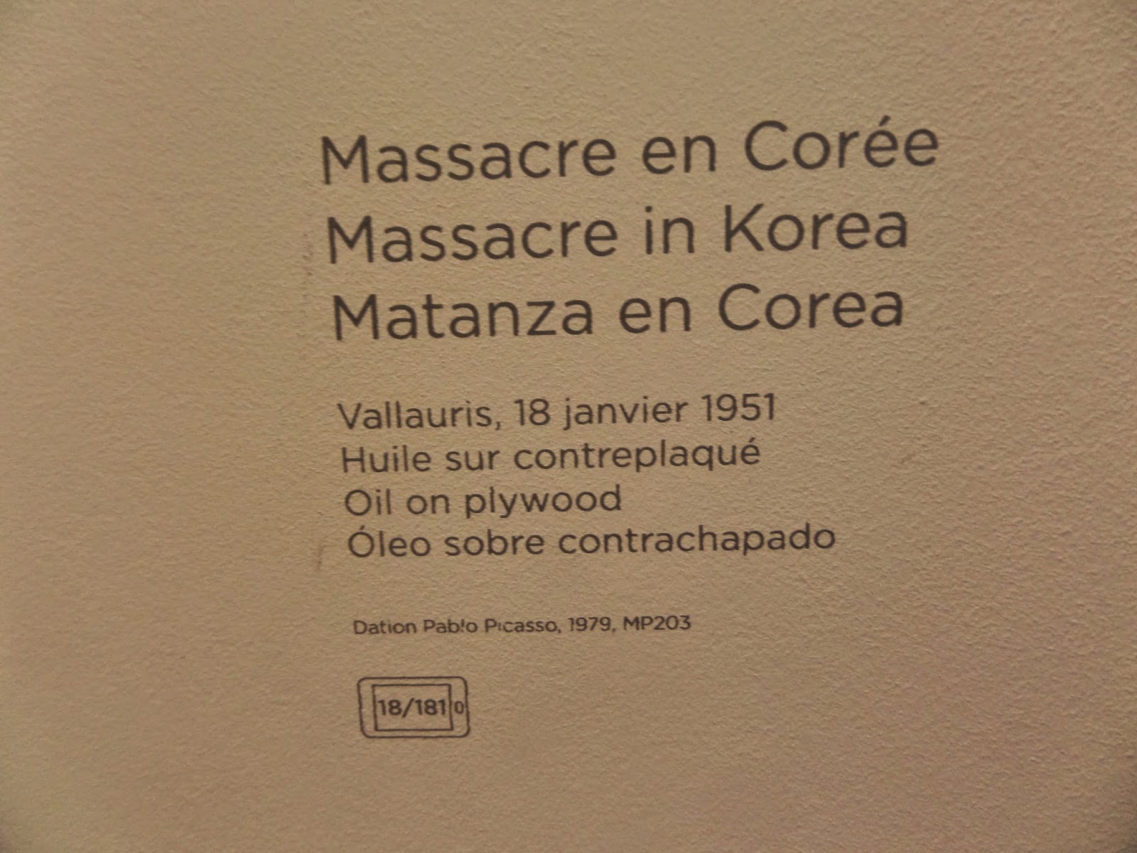 今回のピカソ美術館訪問で見たかった絵の一つがこの朝鮮戦争の絵であった。ピカソはこの絵を南仏のバロリスで1951年1月18日に完成させている。左側に裸の女性と子供を配した。右側には銃殺を遂行する兵士たちが描かれている。右端で剣を水平にかざしているのは隊長なのか一斉射撃で処刑しようとしている絵だ。死を前にした婦女子の表情はさまざまである。それに対し兵士たちは機械かロボットのように精神の枯渇した物体として描かれている。戦争ではいつも殺すのは男で殺されるのは女と子供たち。この絵の前に観客は一番多く集まっていたと思う。長い間時間をかけて見ていた人もいた。不思議なことに軍隊の暴挙に対する怒りよりも銃殺され殺害される婦女子への想いが強く感じられそこに平和に対する切望の共感がおこる絵だ。頭をたれて目に涙をたたえている若い女性が観客の中にいた。有名なゲルニカはスペイン戦争で独裁者フランコを批判した記念的作品だがこのパリのピカソ美術館にはない。セーヌ川の左岸のグラン・ドーガスタン通りにあった屋根裏のアトリエでピカソのゲルニカは描かれた。ここにはその時の写真が地下に展示されている。