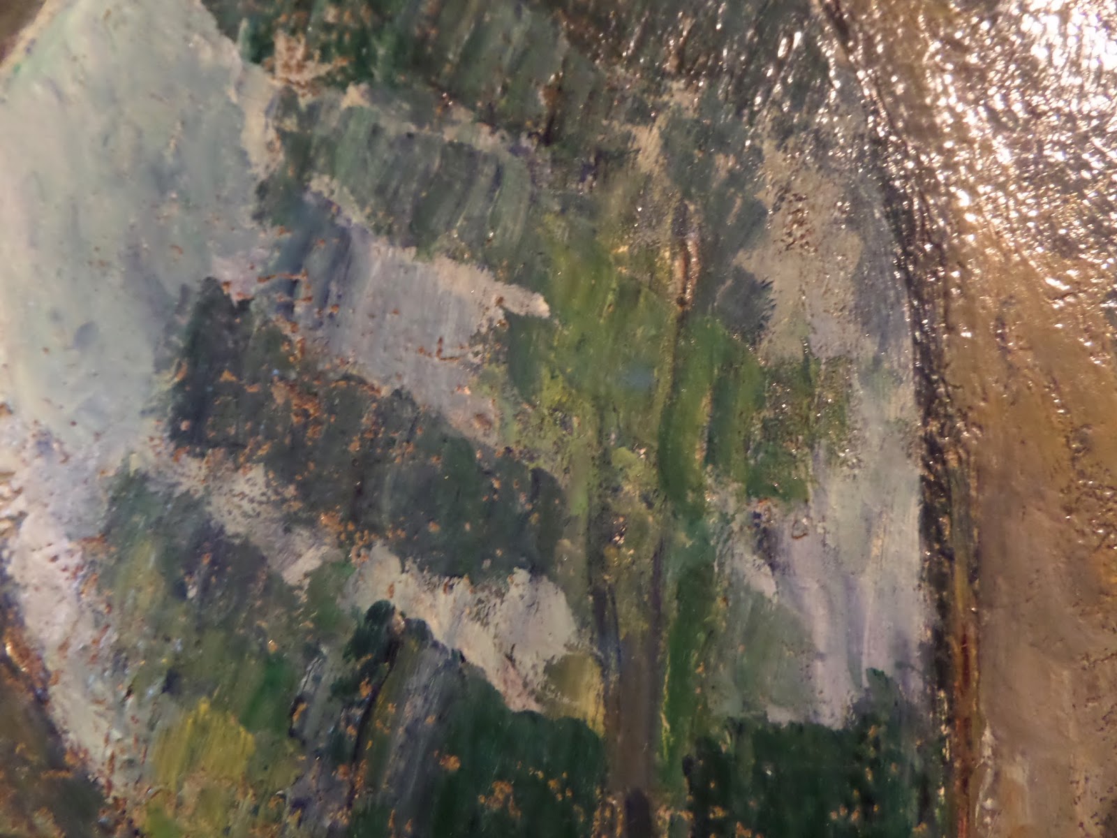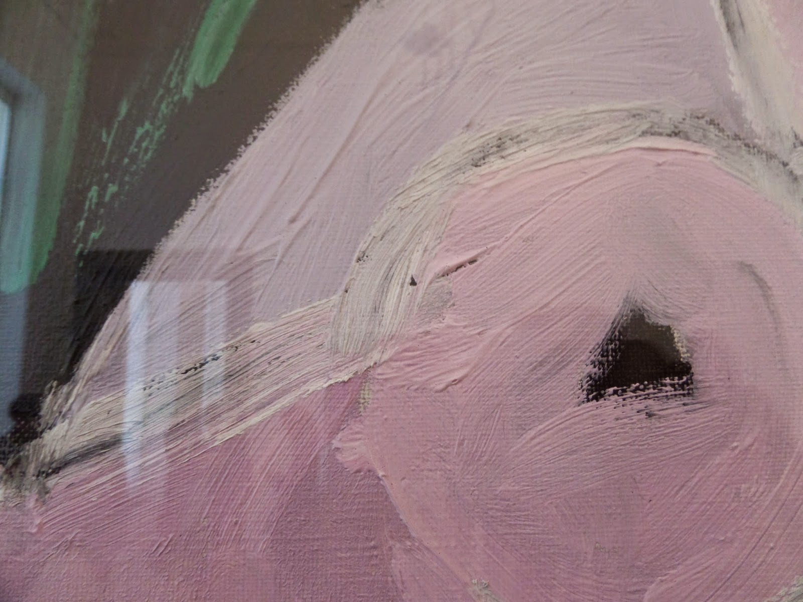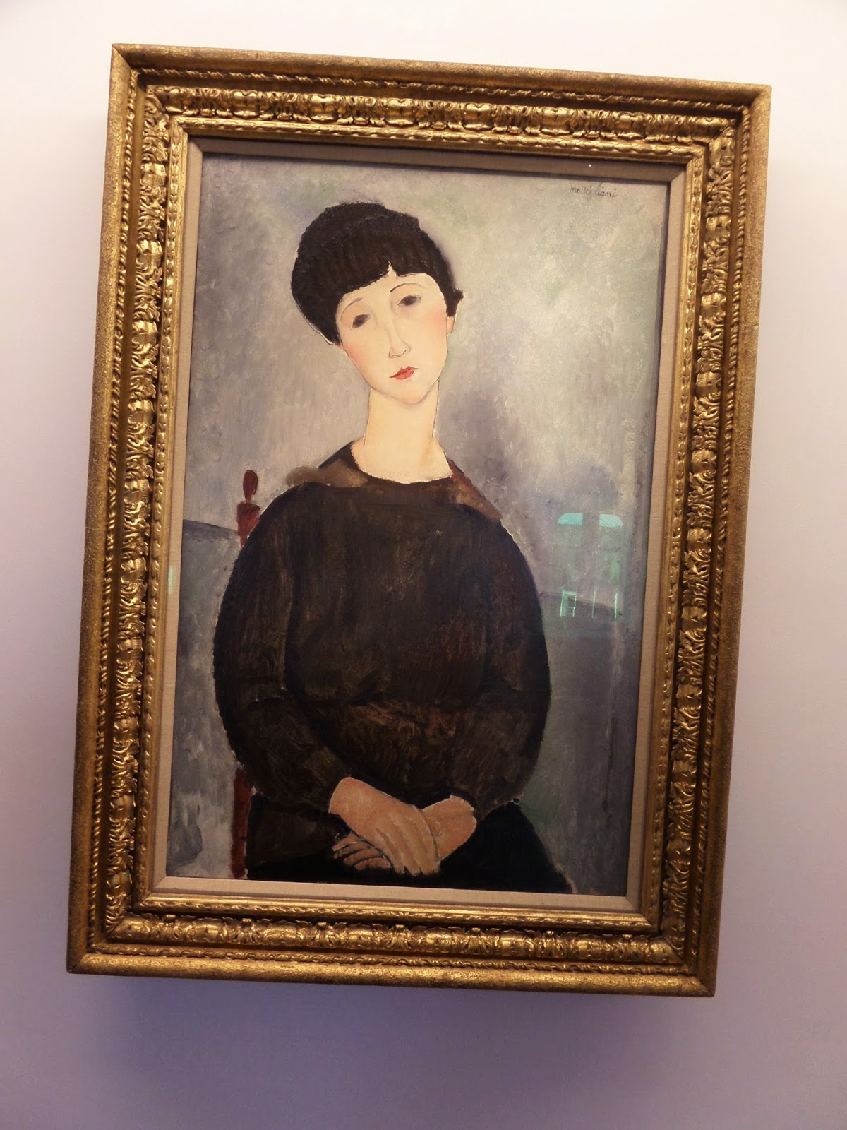 モディリアニーの絵は首が長い、身体も細長い。この写真はわざと斜めに撮ったのではない。人を見るときにもしも人の顔が斜めに傾いていれば見る人はその顔を縦に見ようとするということである。この頭部の傾きをさらに強調しているのが画面中央部の水平線の傾きである。この絵はいろいろと傾きが仕組まれていて美しい女性の絵ではあるが不思議な静けさと神秘性を漂わせている。