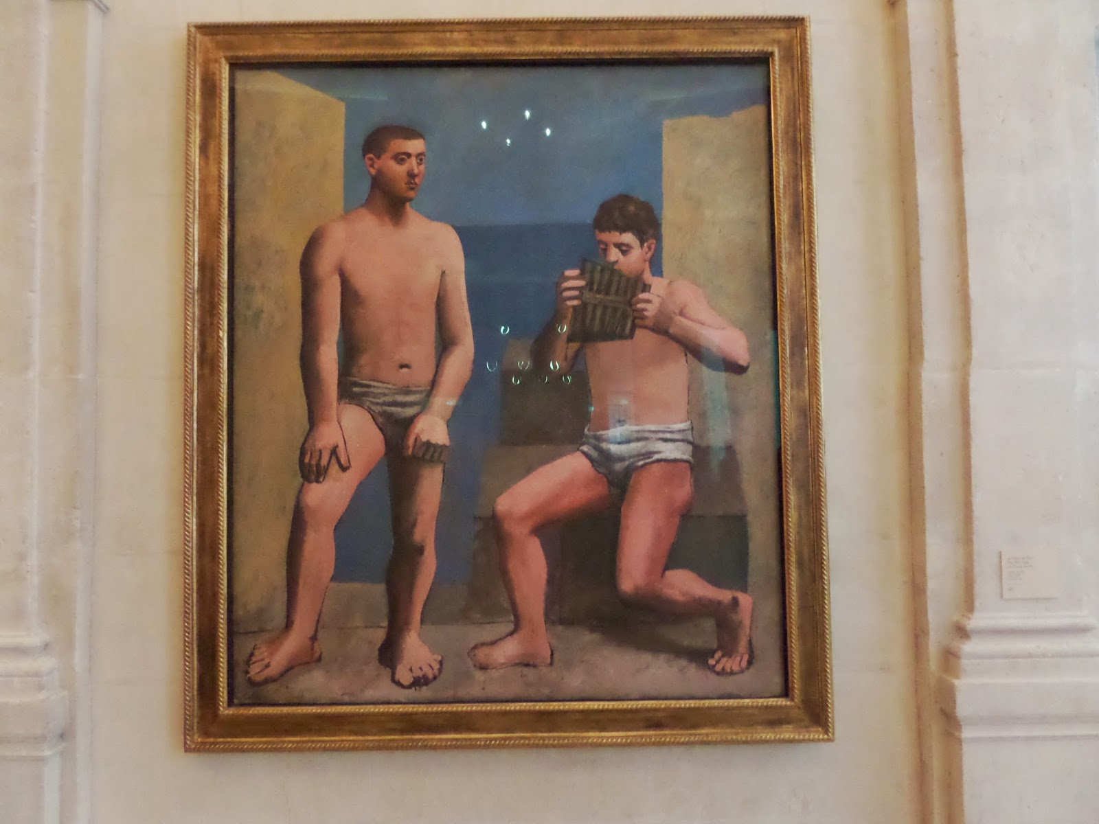 ルイ・ルナンの絵を彷彿させる。ルナンの絵(ルーブル美術館)では貧しい農村の生活風景を描いた17世紀のプロテスタントの思想を表していると思える。少年が笛を吹いていて静かな絵だがそこに高い精神性を感じる絵だ。ピカソはそういう人間の思想性の深いところを狙って描くことをした画家ともいえるのだ。