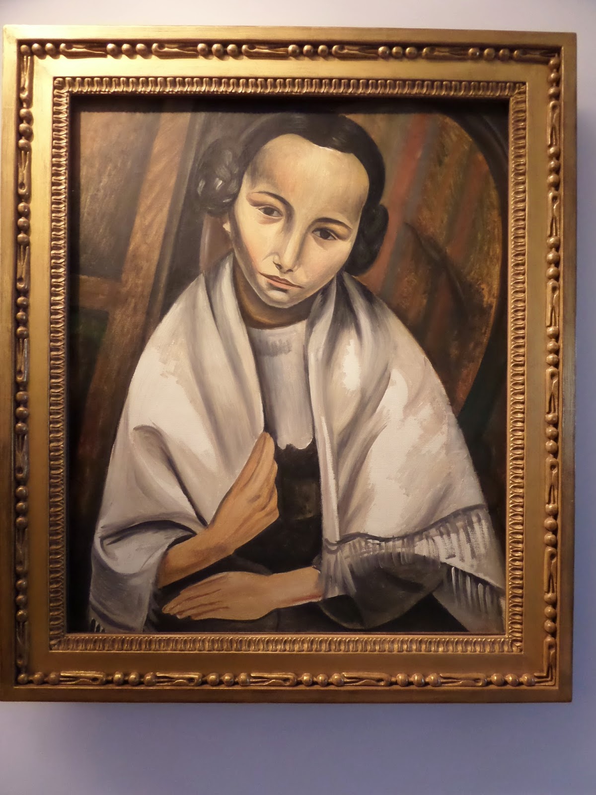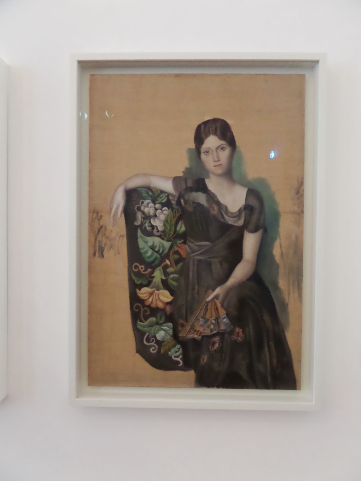 オルガ婦人の肖像だが、椅子にもたれて立っているのか座っているのかわからない絵だ。これはセザンヌの作品でオルセー美術館にある「カフェチエーの前の青い服を着た女」とよく似ていると思う。