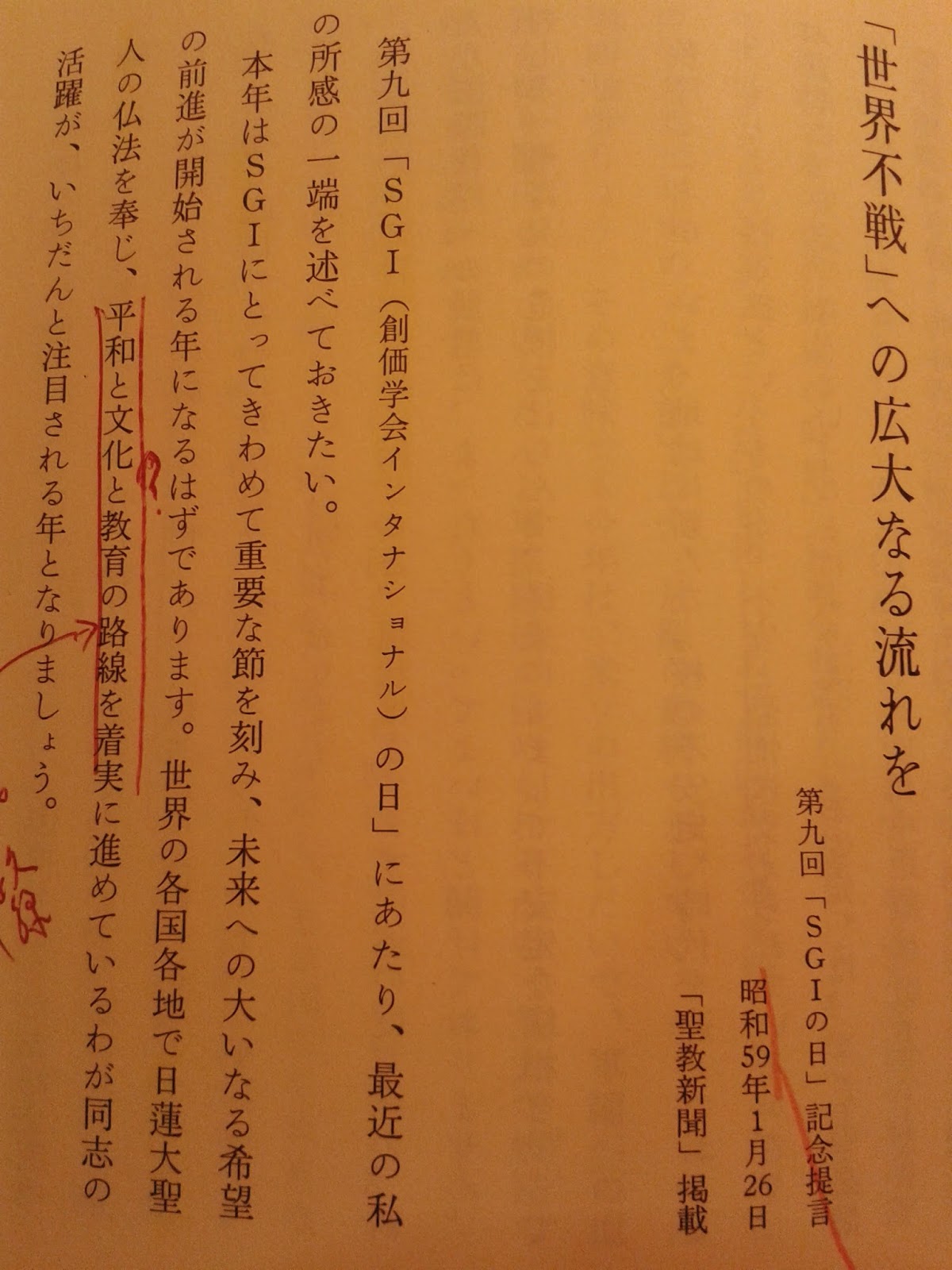安倍晋三首相の方は、これから推測がいくと思うが、実は安倍が最近に口にしている「不戦の誓い」という呪文は、これよりもずっと以前に創価学会の池田大作が頻繁に使用していたのである。