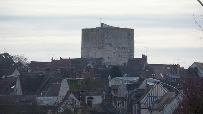 ウーダン(Houdan)の天守閣。町の中には中世の町に良く見られる、「大通り」(Grande Rue)と名前のついた、町を貫通し城壁の両端にある門から出入りする通りがここでもあった。近くで見るとこの天守閣は四角ではなく、より死角領域を少なくした、四角柱の四隅に円筒が付けられた型である。ここではまだ萌芽的な設計プランではあるが、おそらくはヴァンセーヌの城の形に移る過度期のもののようだ。その後は、防衛力を増した円柱の天守閣が一般的になっている。