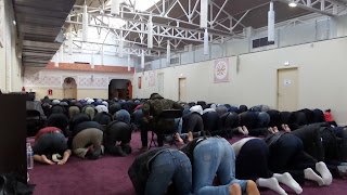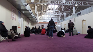 祈りは一日に5度ある。そのつど6分間程の祈りをするのだといった。見ても良いかと聞くと、中に招き入れてくれた。靴を脱いで下駄箱にしまい、モケットの敷かれた広間に座った。写真は撮ってもよいかと尋ねると、後ろからなら撮っても良いという。彼らは声は殆ど出さずに立ったり座ったり頭を床に擦りつけたり何度も同じことを繰り返している。
