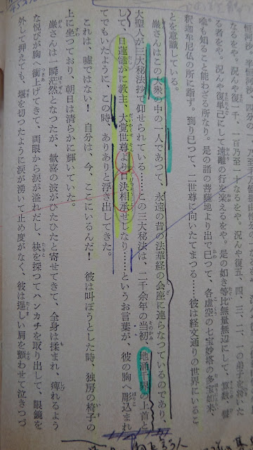 戸田城聖の獄中の悟りの箇所で、日蓮大聖人の「三大秘法抄」の御文の文底の読み筋を削り取って隠し捨てているのが「・・・・・・」でわかる。以下に掲載したのが日蓮大聖人の「三大秘法抄」である。戸田の隠した「・・・・・・」の所が、日蓮大聖人の正しい主張であるので、御書をお持ちの方は取り出してご自身でしっかりと読まれてほしい。