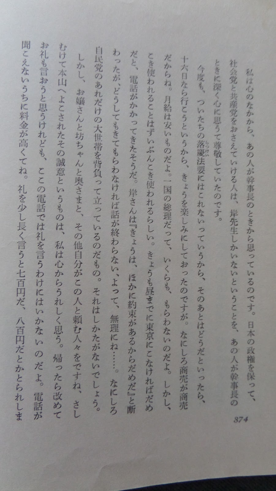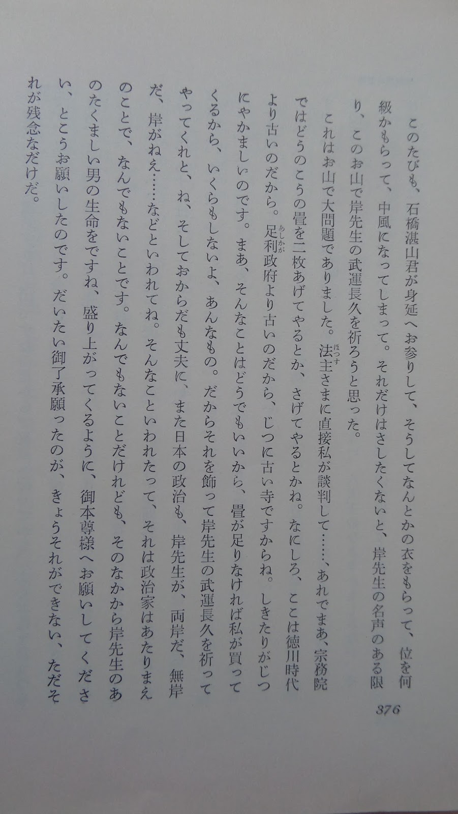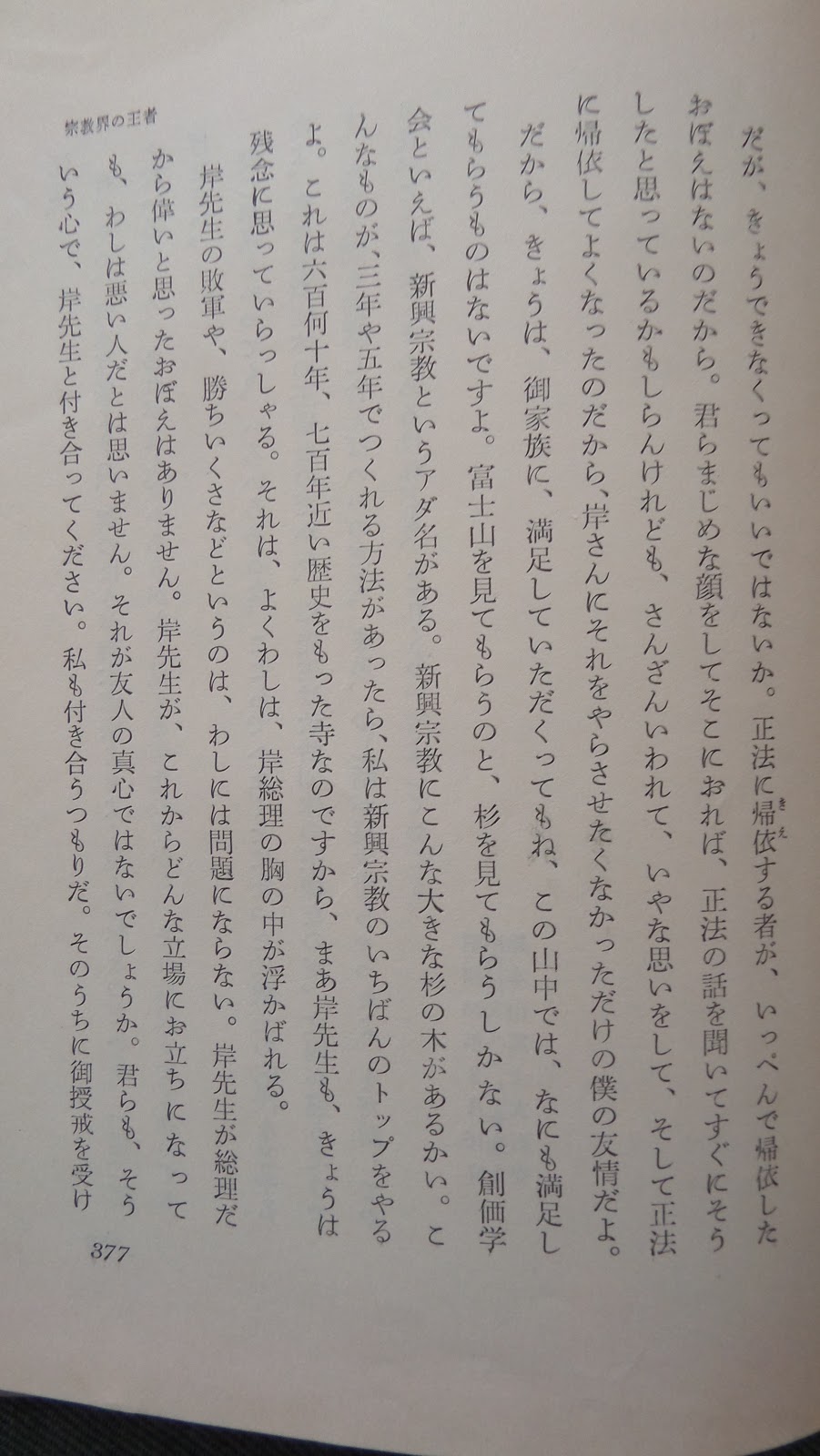 その中で戸田は、自民党の岸首相の「武運長久を祈ろうと思った」「同書」(376頁)というのです。しかし、岸信介は約束を果たせず大石寺に来なかったので、これを祈ることはできなかったとしてとても残念がっていて、次のような戸田の文章が残っている。これが非常に面白い。「石橋湛山君が身延へお参りして、そうしてなんとかの衣をもらって、位を何級かもらって、中風になってしまって。それだけはさしたくないと、岸先生の名声のある限り、このお山で岸先生の武運長久を祈ろうとおもった。」「同書」(376頁)とあるのです。