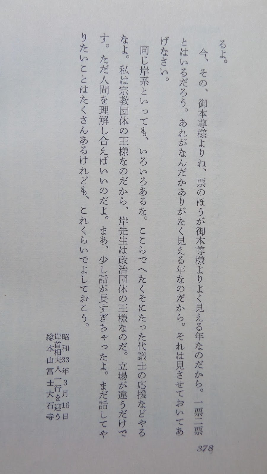 岸信介が戸田城聖の友達だとかで、昭和33年3月16日に岸信介夫人一行を迎うと言う文章があるのを思いだしたのです。広げて見てみると、この日、岸信介首相はその頃の創価学会が本山として信仰していた日蓮正宗総本山富士大石寺に、戸田城聖第二代創価学会会長から昭和33年3月16日に招待されていたのです。岸首相は急に当日になって行けなくなったとして、代わりに婦人(良子)と娘(洋子)と男の子(安倍晋三と考えられる)を送って来たという話しです。